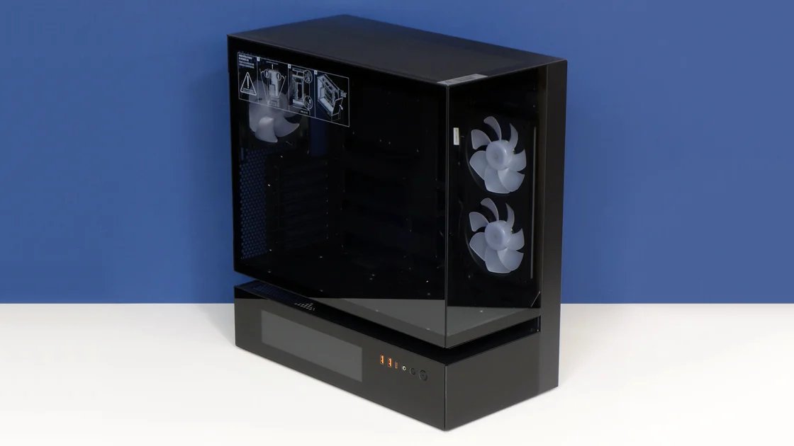 The cut-out hole between the 2 chambers is extra evident whenever you view the case from the rear, the place a single rear panel covers each chambers’ backs. A 120mm ARGB fan is fitted to height-adjustable slots up high, the upside-down energy provide bay is inset deeply down under, and the dual 120mm ARGB consumption followers are faintly seen off to the facet by perforations in the fitting panel.
