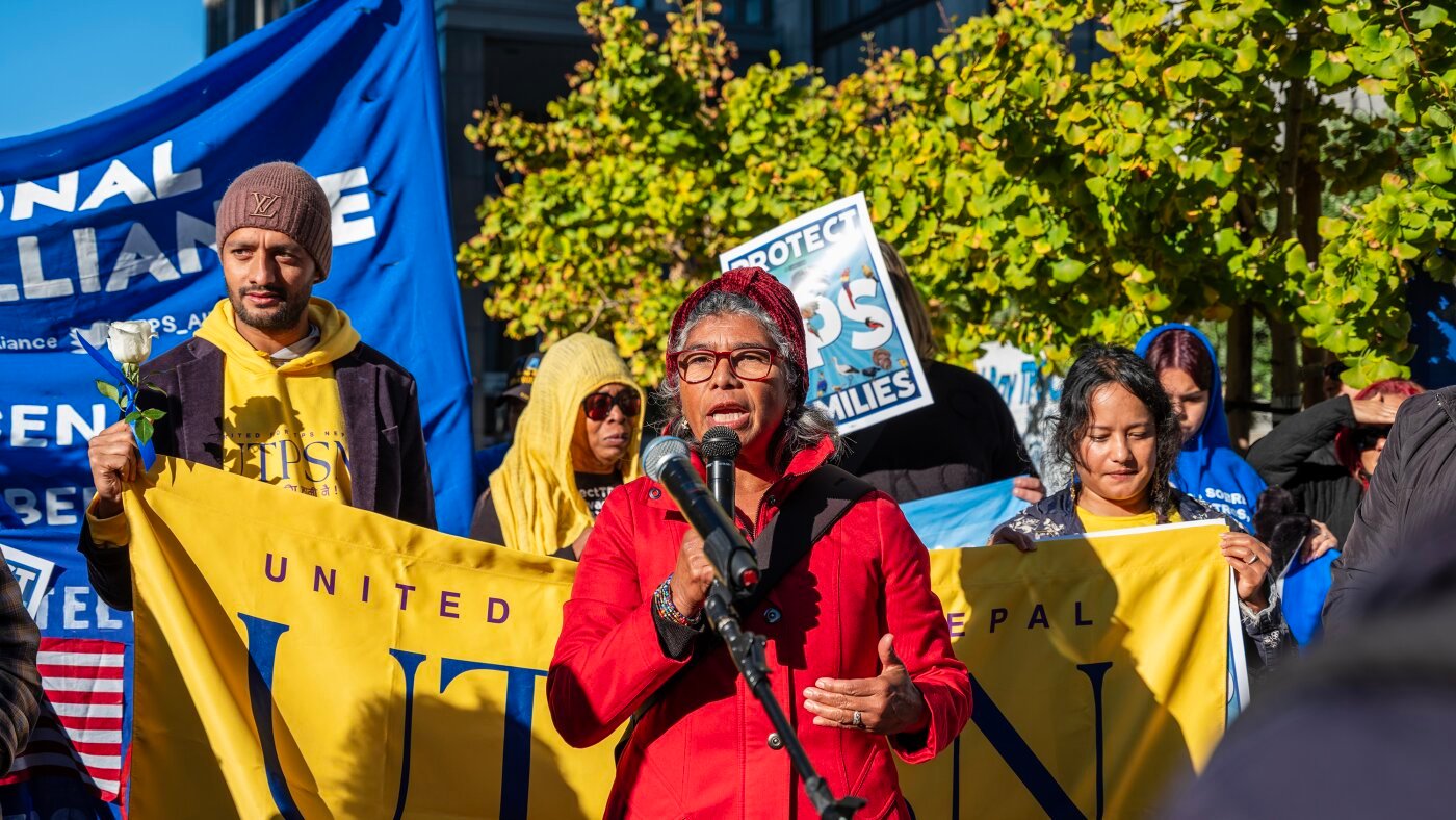 Rosa María Carranza attends a protest supporting the non permanent protected standing program exterior the Phillip Burton Federal Constructing and U.S. Courthouse in San Francisco on Nov. 18, 2025. Carranza, a resident of neighboring Oakland, worries she might lose her authorized standing and danger indefinite detention or deportation.